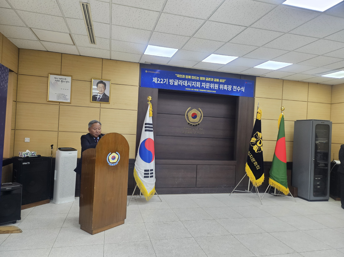 박영식 대사는 2025.11.23.(일) 대사관 대회의실에서 제 22기 민주평화통일자문회의 서남아협의회 방글라데시지회 자문위원 위촉식을 열고 위원들에게 임명장을 전달하면서 동포 사회 및 주재국 내 평화통일 공감대 확산 등 활발한 활동을 당부하였습니다.